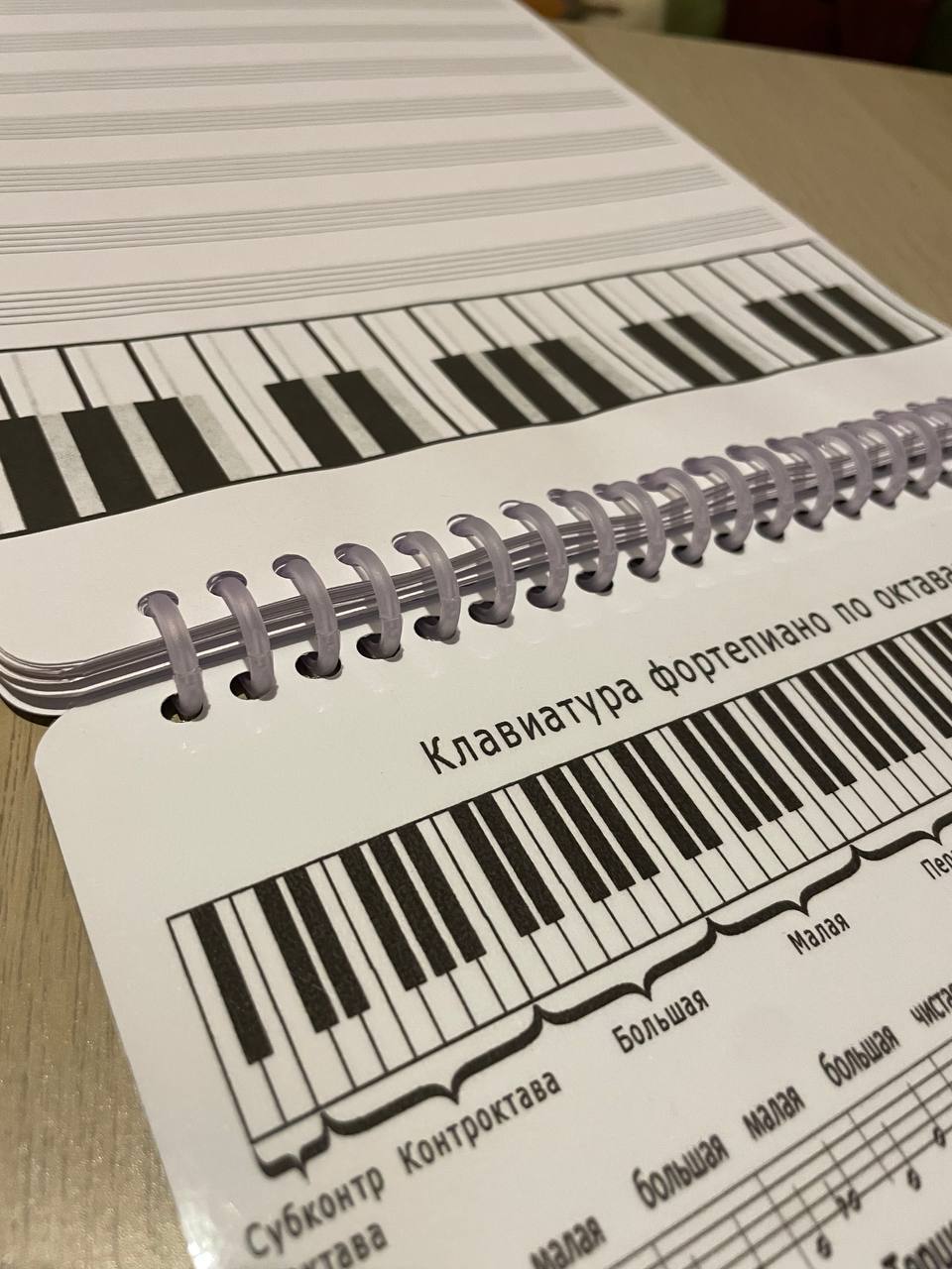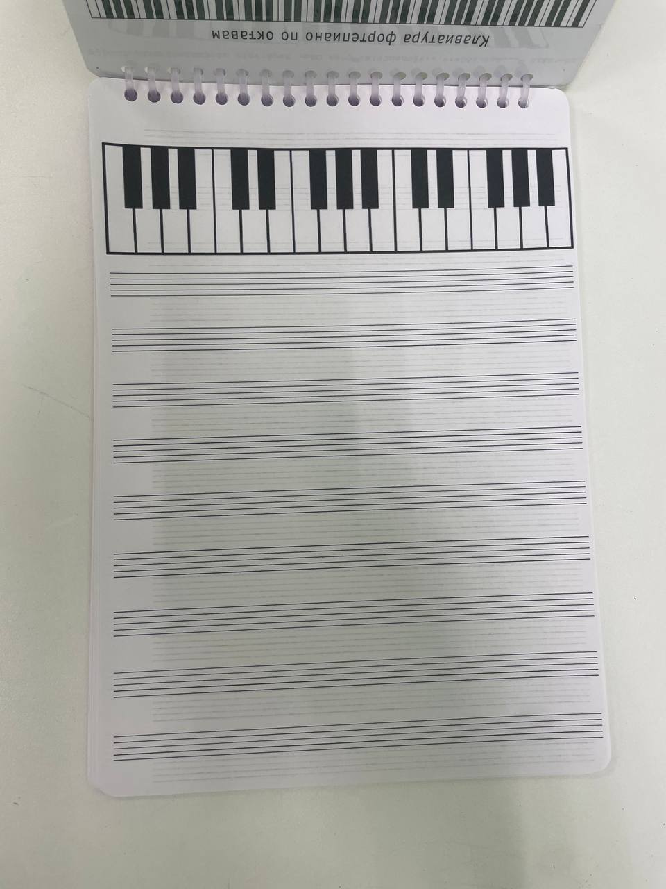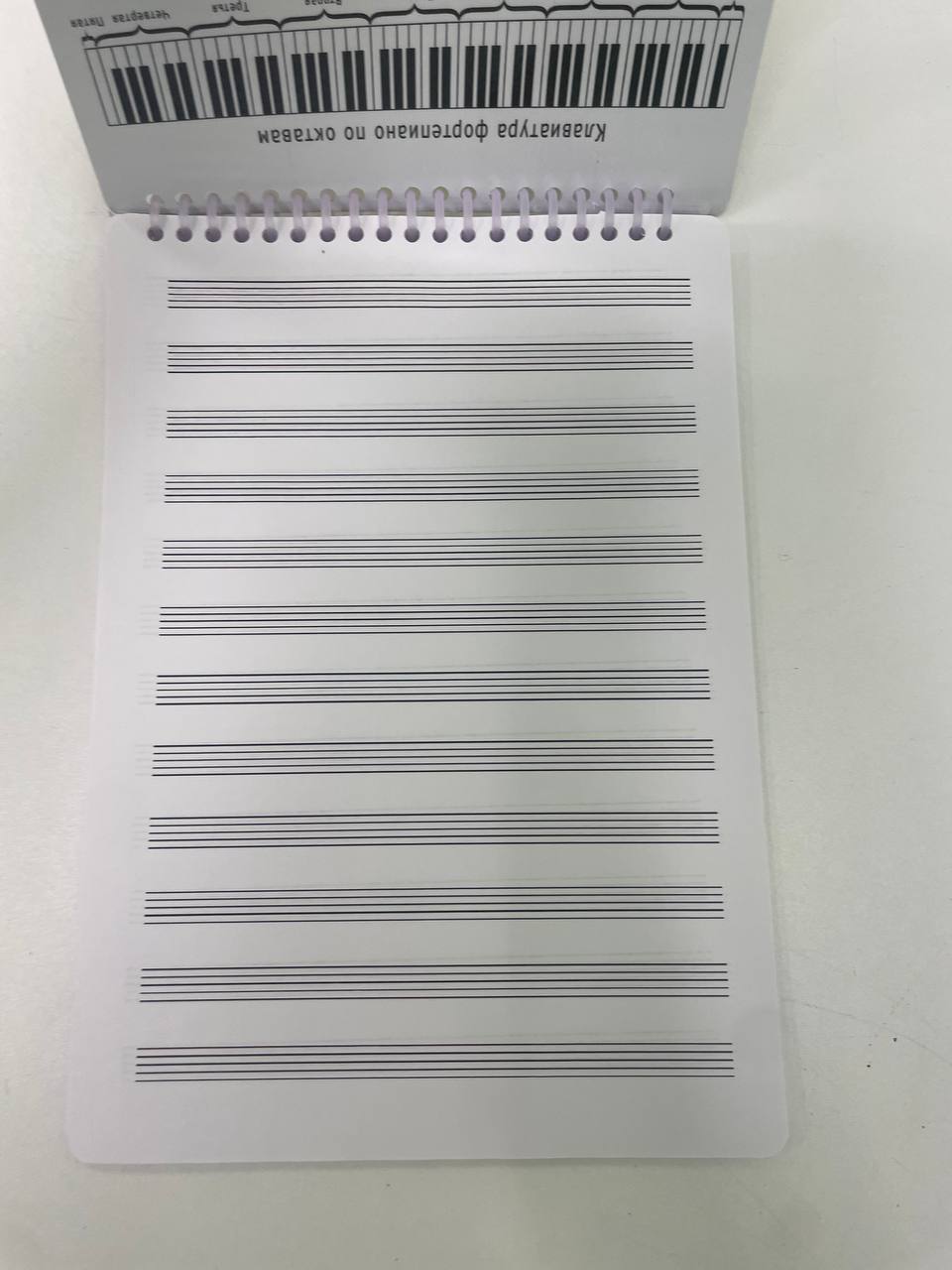 Нотная тетрадь с клавиатурой, для удобной работы с интервалами, аккордами, транспонированием и т.д. 20 листов с клавиатурой и 5 листов для заметок. Ламинированная обложка сохранит надолго шпаргалки, даже если тетрадь закончится, многоразовая пружина подойдёт для блокнотов и записных книжек, а заметки вначале и в конце тетради дадут ответы на возникшие вопросы.