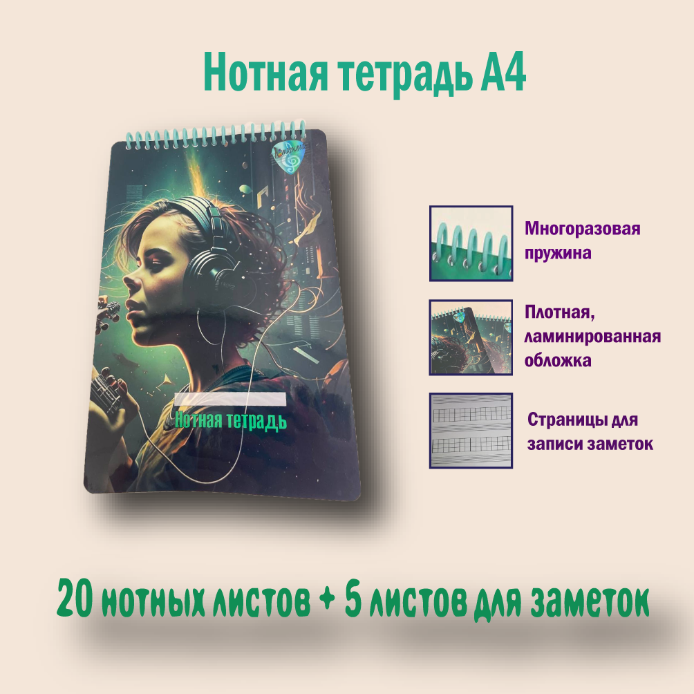 Нотная тетрадь, 20 листов с нотным станом и 5 листов для заметок. Ламинированная обложка сохранит надолго шпаргалки, даже если тетрадь закончится, многоразовая пружина подойдёт для блокнотов и записных книжек, а заметки вначале и в конце тетради дадут ответы на возникшие вопросы.