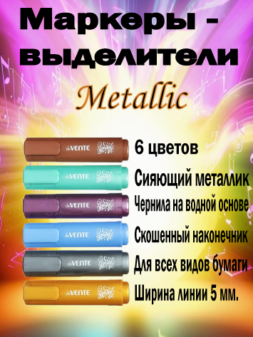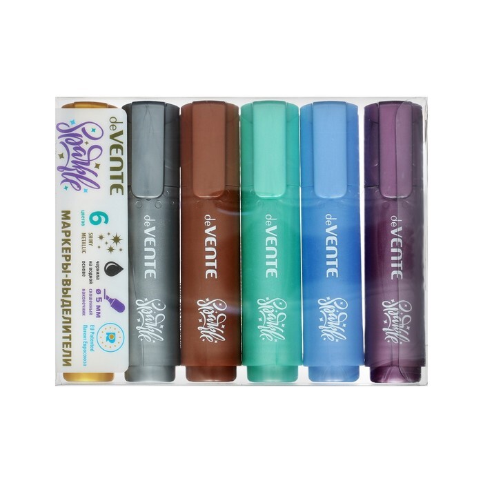 Набор маркеров-выделителей deVENTE. Sparkle (6 цветов - розово-лиловый, синий, зеленый, серебро, золото, бронза) цвета METALLIC с БЛЁСТКАМИ, плоский корпус, скошенный наконечник, ширина линии 1-5 мм, в пластиковом блистере.