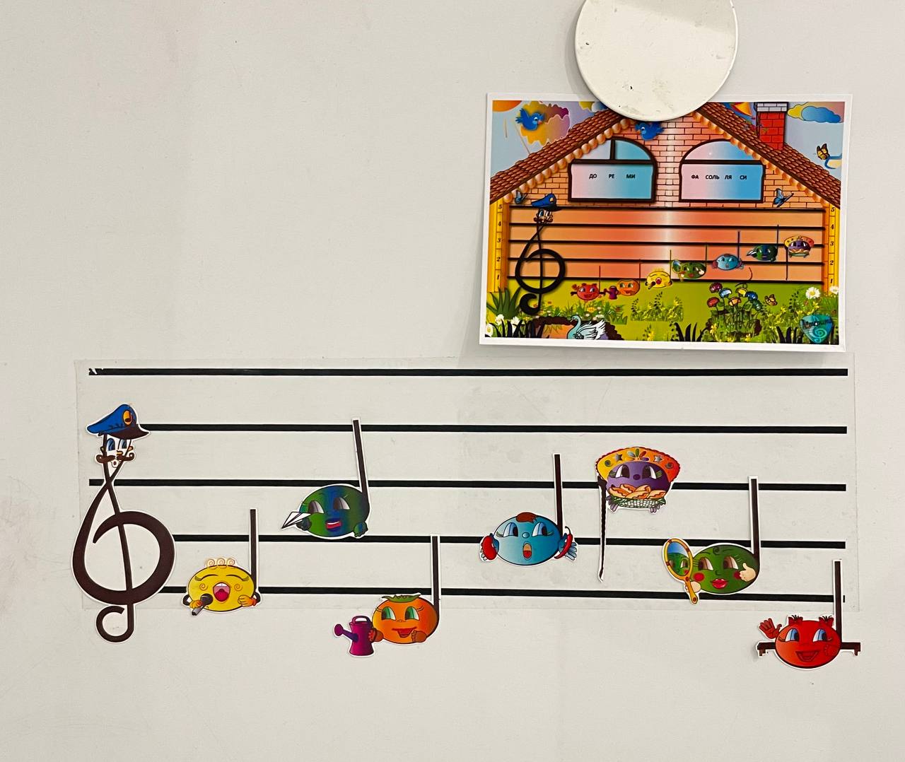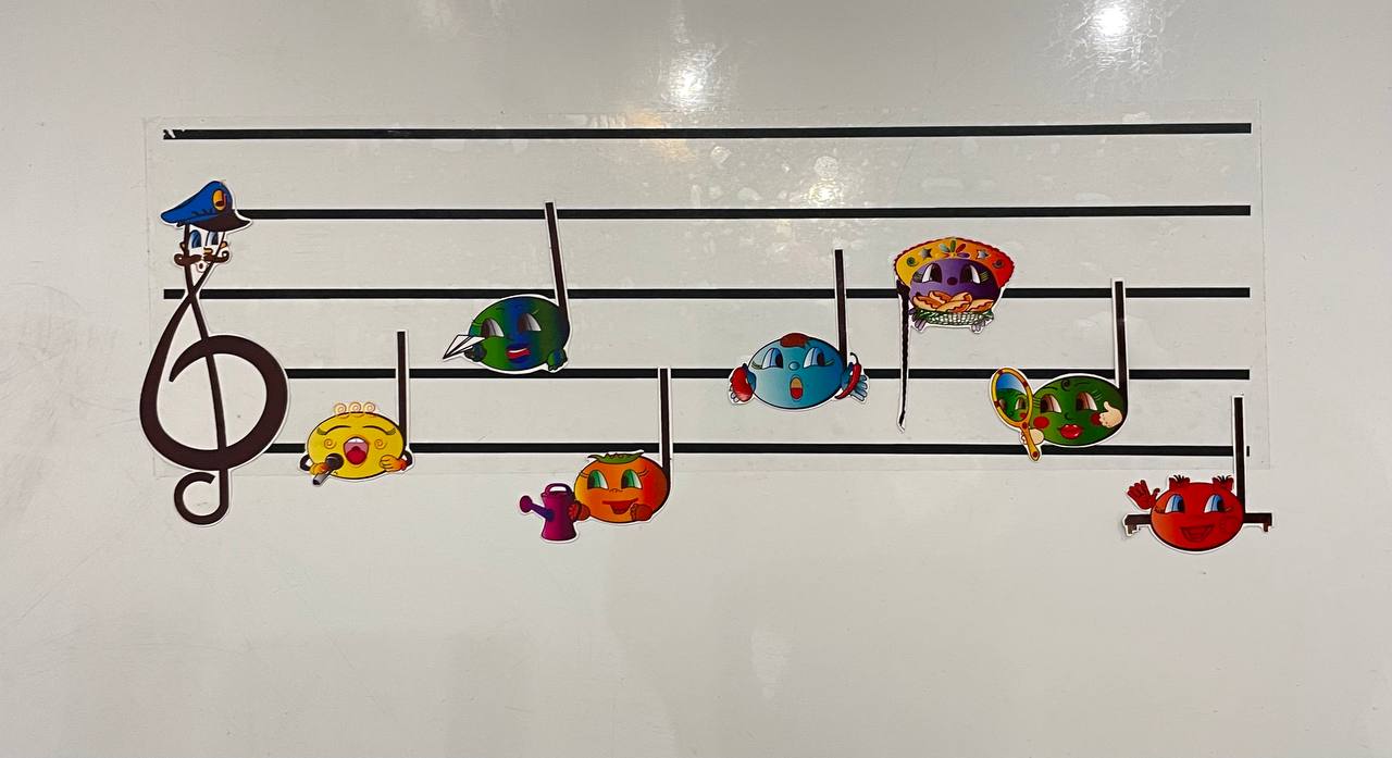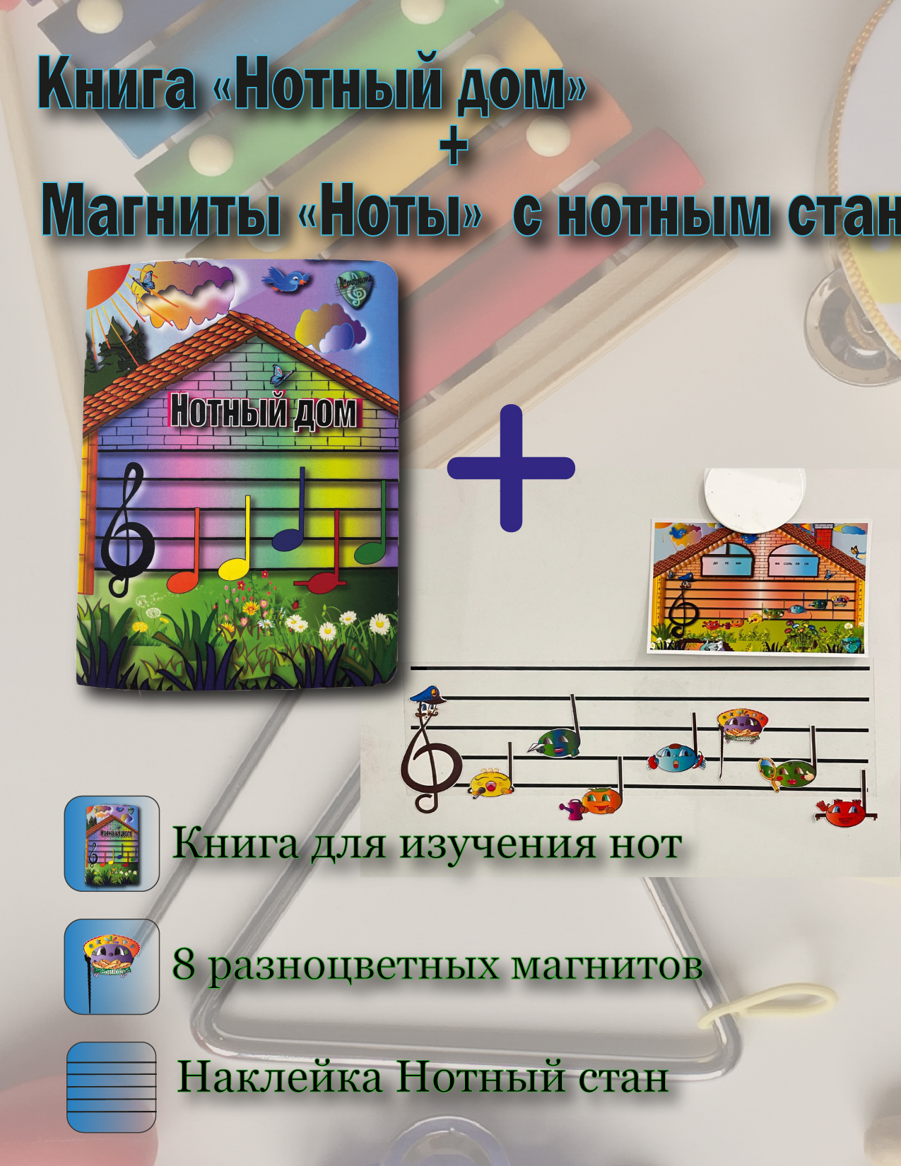 Комплект состоящий из книги и магнитов поможет вам веселее и интереснее узнавать расположение нот на нотном стане.