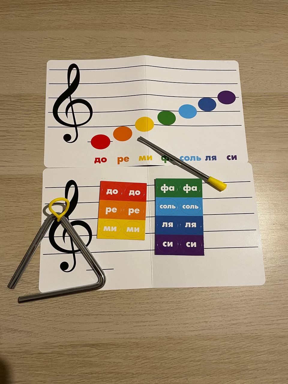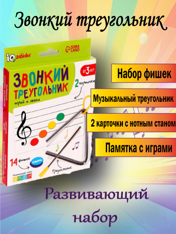 Развивающий набор «Звонкий треугольник» познакомит малыша с миром музыки и основами нотной грамоты. Внутри вы найдёте музыкальный треугольник, палочку, 2 карточки и набор фишек с названием нот.